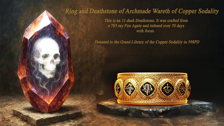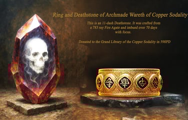 DeathStones are generally small precious or semi-precious gems which are infused with Focus and attuned to a specific individual. The power of the DeathStone is related to the type, size, and cut of the gem, as well as the Focus imbued into the stone.