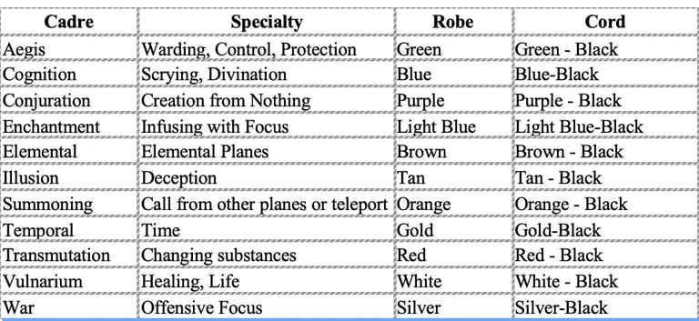 Necromancy (Vulnarium): Death/Disease – Black Robe, White Cuffs (Only sub-cadre with distinct robe color)