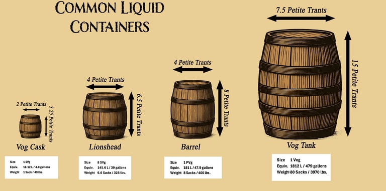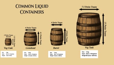While the Vog Tank is generally the largest container routinely used, there is also a Grand Vog Wagon. It is an integrated Tank/Wagon that can carry a Gv amount of liquid. Its filled weight is roughly 800 Sacks (16 Wagons) - which is about 40,000 lbs. The wagon is designed with an internal crank lift which allows draining of the liquid - as well an integrated hand pumping system. The tank dimensions for this is roughly 2 Trants diameter and 3.25 Trants length (note, this size if for the tank portion - not the entire wagon, which is slightly wider and longer.